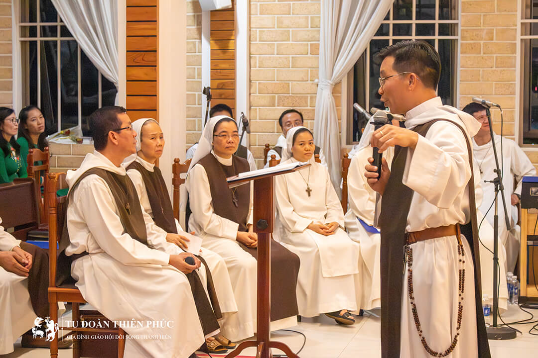 Đêm cầu nguyện được tiếp tục với phần chia sẻ của thầy Phao-lô Giu-se Vũ Đình Trung dựa trên đoạn Lời Chúa trong thư của Thánh Phao-lô Tông đồ gửi tín hữu Rô-ma, chương 5, câu 1-5. Thầy chia sẻ: “Chị Thánh Tê-rê-xa luôn sống tin yêu phó thác cuộc đời mình vào vòng tay yêu thương của Thiên Chúa, và chính nơi đó chị trở thành tấm gương phản chiếu tình yêu của Đức Kitô”. Thầy cũng trích dẫn đoạn Lời Chúa do chính mình công bố: “Trông cậy như thế, chúng ta sẽ không phải thất vọng, vì Thiên Chúa đã đổ tình yêu của Người vào lòng chúng ta, nhờ Thánh Thần mà Người ban cho chúng ta” (Rm 5,5), để khích lệ mọi người sống tinh thần phó thác giữa những thử thách của cuộc sống.